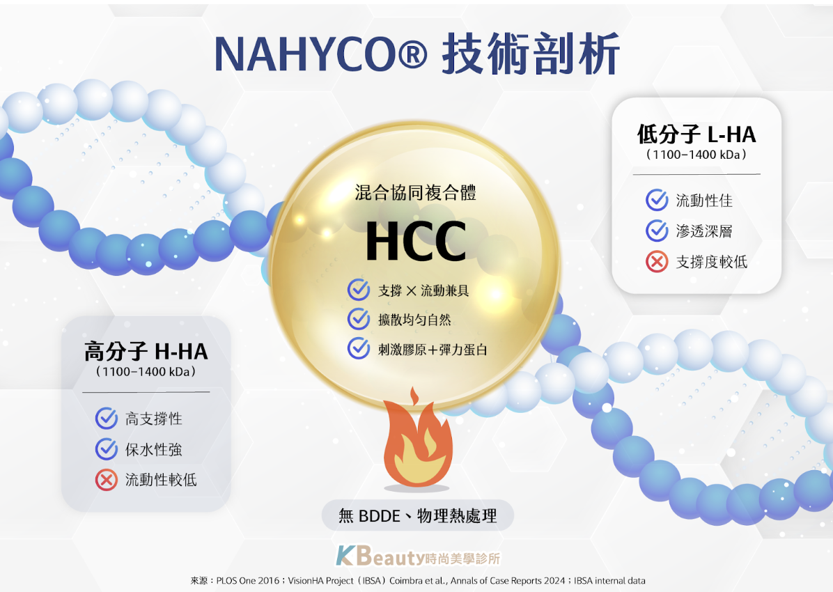 有別於傳統使用化學交聯劑(如BDDE)將玻尿酸「黏」起來的填充劑,PROFHILO 採用了專利的 NAHYCO® 混合技術。此技術將高分子量(H-HA, 1100-1400 kDa) 與低分子量(L-HA, 80-100 kDa) 的純化玻尿酸,以特定比例物理性混合,形成穩定的「混合協同複合體」。