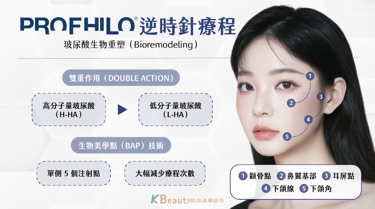 PROFHILO 逆時針 是由 IBSA Farmaceutici Italia 研發的一款透明質酸 (HA) 生物重塑注射產品。相較於傳統玻尿酸填充劑,其主打「生物重塑 (bio-remodelling)」——不只是填補體積,而是透過高分子+低分子玻尿酸的複合劑型,刺激膠原蛋白與彈力蛋白生成。